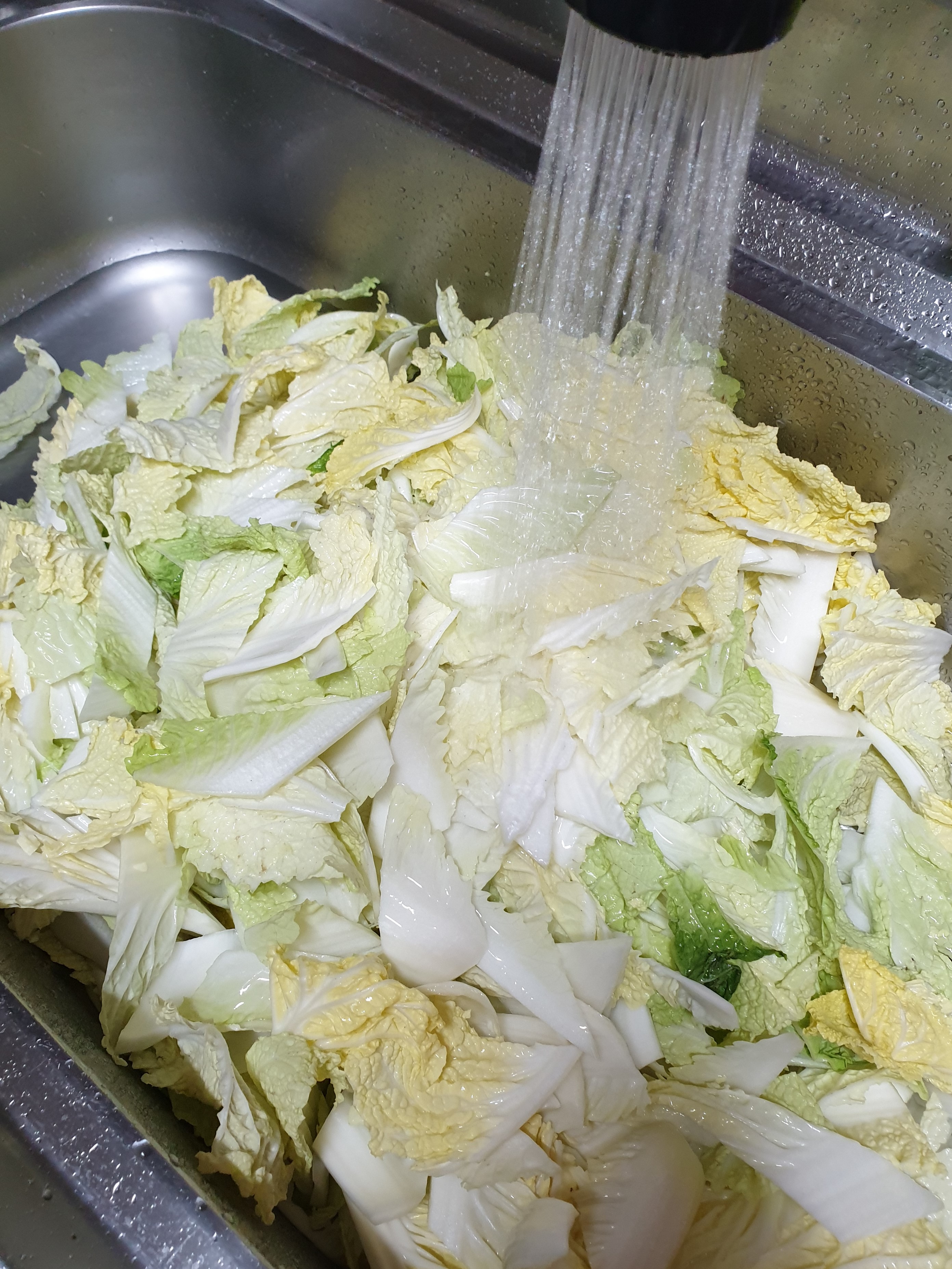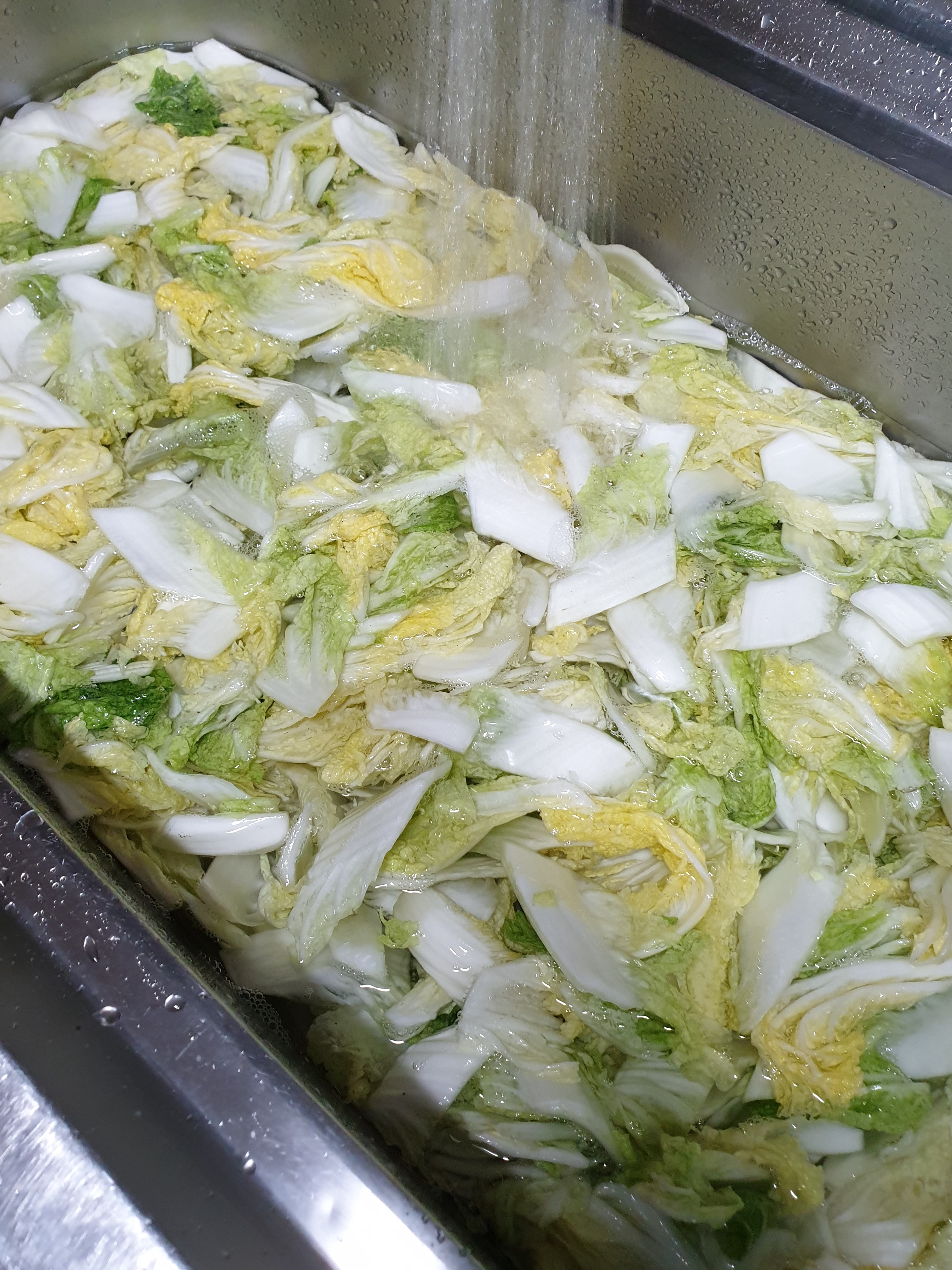 배추가 잘 절여졌으면 물로 3번 씻어줍니다