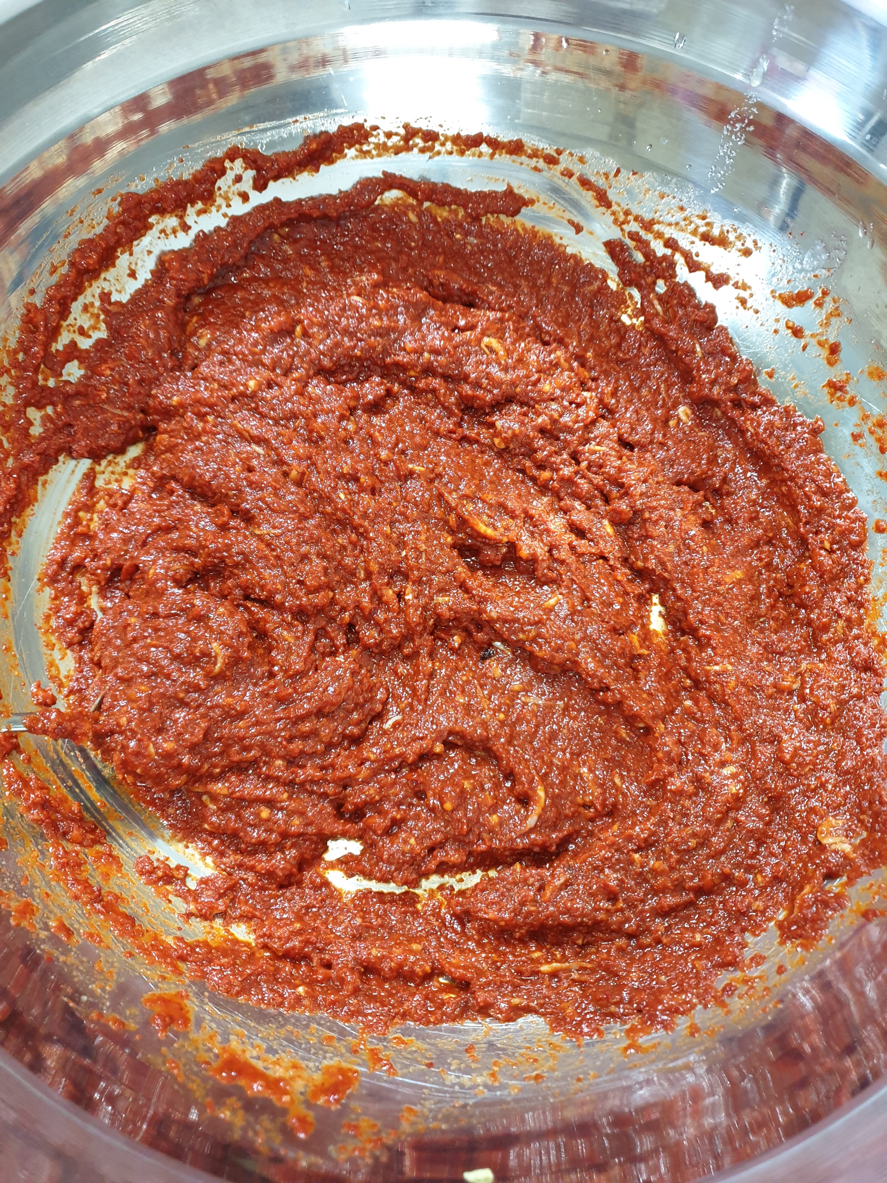갈아놓은 양념에 고춧가루 4 국자 넣고 잘 썩어 준비합니다