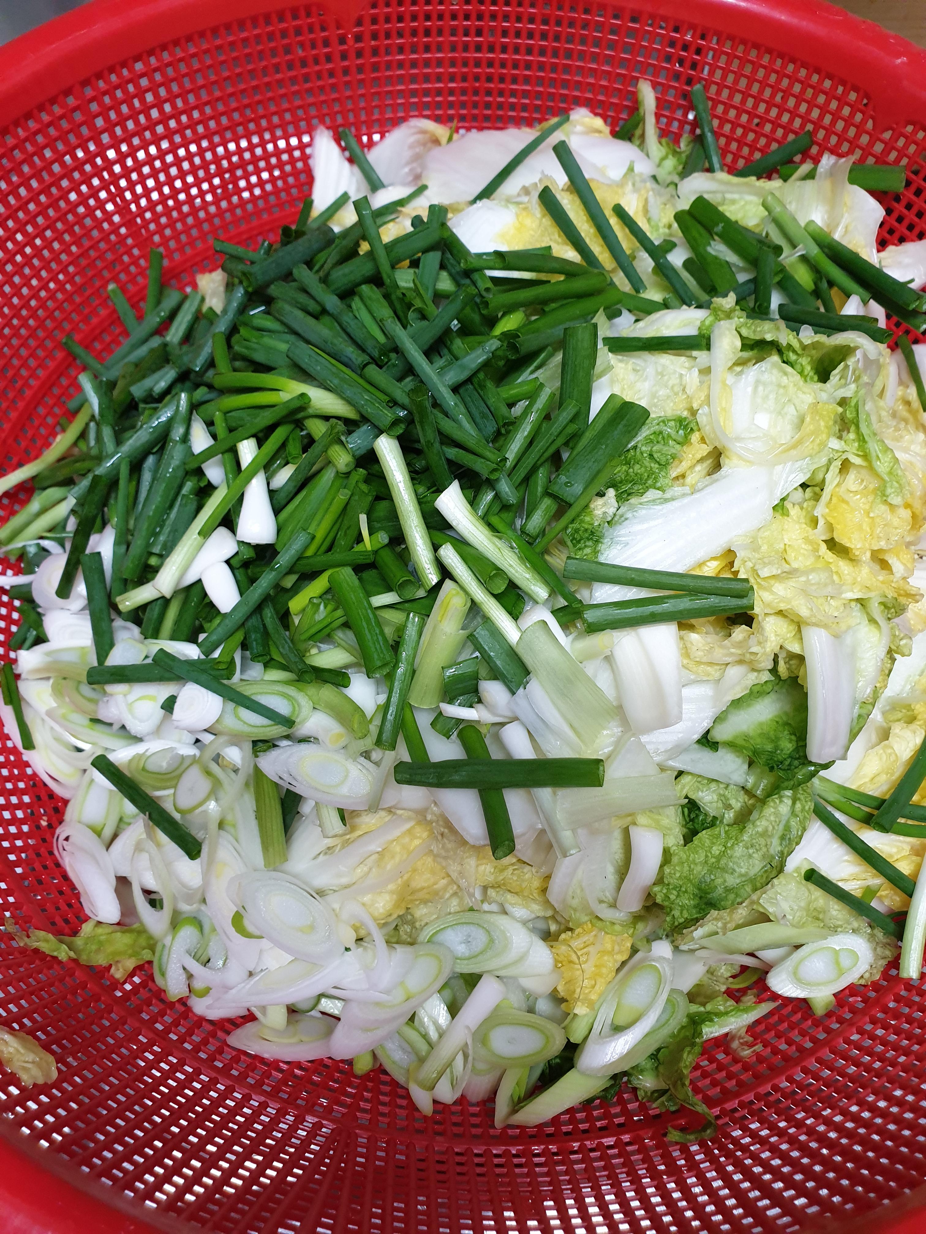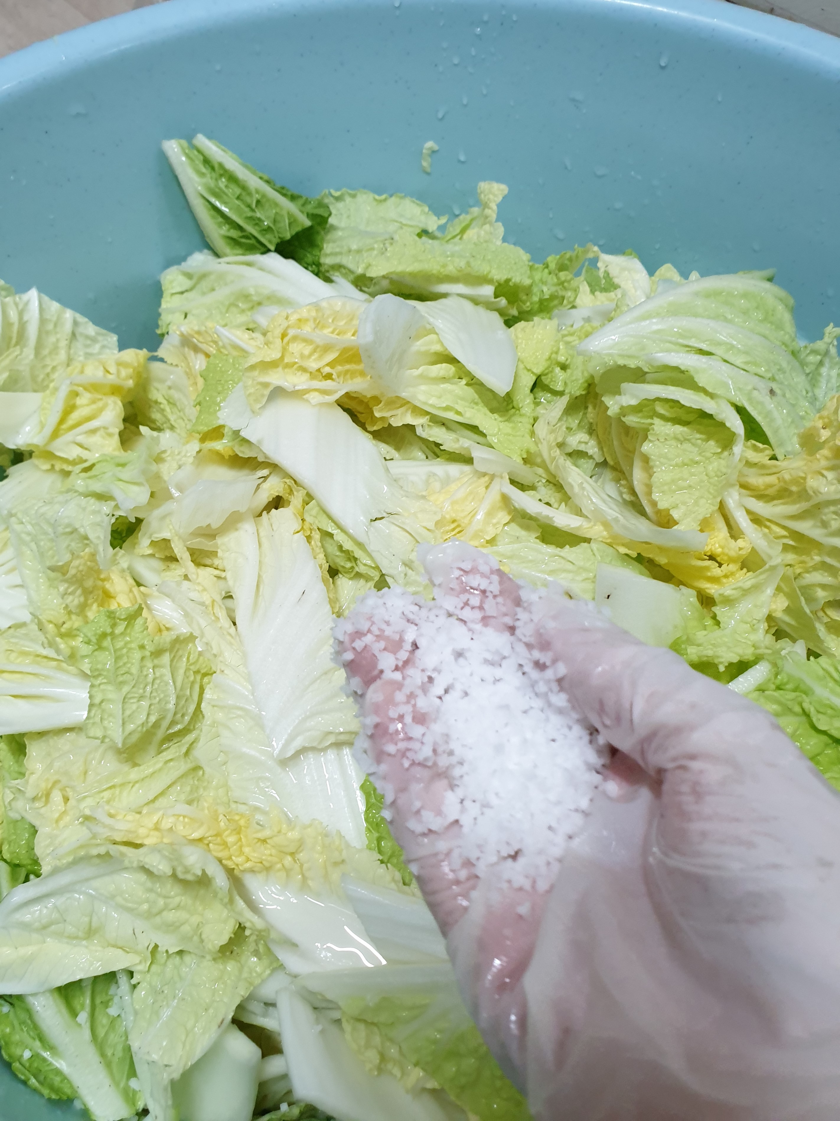 재료; 배추 2포기, 굵은소금 2컵, 쪽파 한 줌, 대파 2대 흰 부분만, 다진 마늘 2큰술, 고춧가루 4 국자,